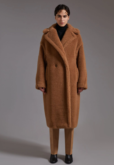 それで熟考を重ねて、何度も試着してテディ―ベアのショートでテディベアケープのSandと言う色を購入しました。まだ着た写真がないので、写真はMax Maraさんからお借りしました。