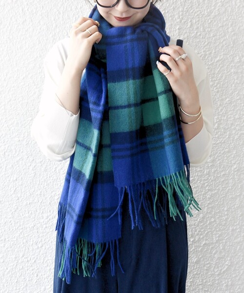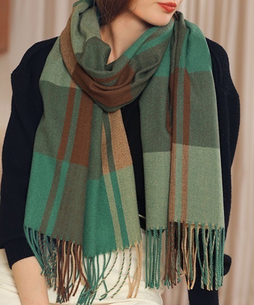 Coo+i チェック柄カシミヤタッチストール グリーン