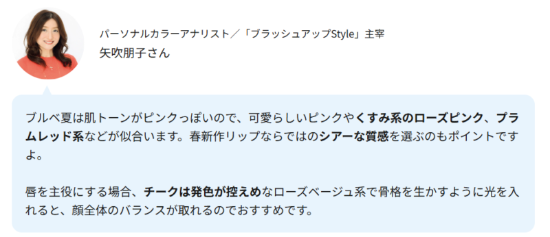 私がパーソナルカラー別のコスメの色選びのコメントなどもしています。